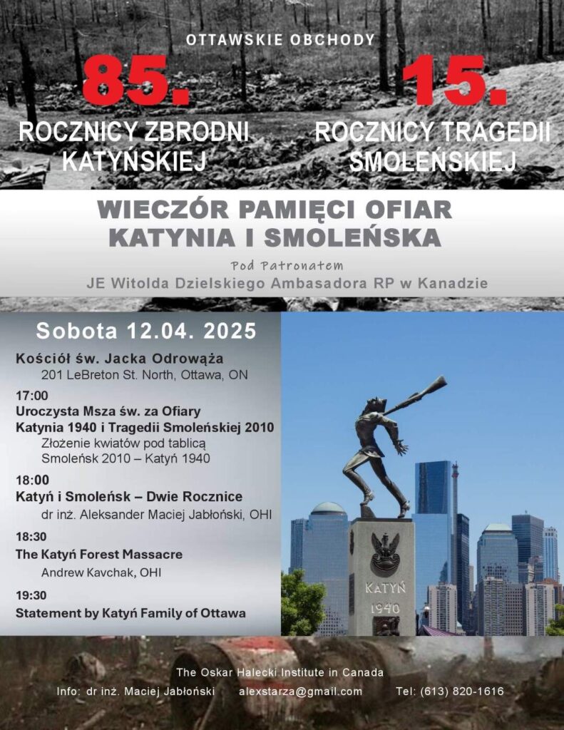 Zarząd Instytutu zaprasza wszystkich Państwa i Polonię Ottawską na Obchody 85. Rocznicę Zbrodni Katyńskiej i 15. Rocznicy Tragedii Smoleńskiej w sobotę 12 kwietnia 2025 r.