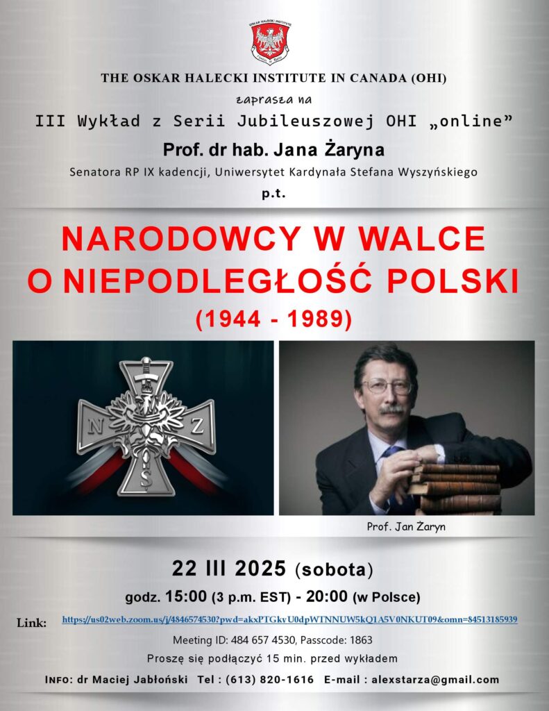 III Wykład Jubileuszowy OHI p.t. ,,Narodowcy w walce o Niepodległość Polski (1944 – 1989)” wygłosi wybitny polski historyk, Prof. dr hab. Jan Żaryn, Senator RP IX kadencji, Instytut Historii Uniwersytetu Kardynała Stefana Wyszyńskiego, 22 III 2025 (sobota) na platformie ZOOM o godz. 15:00 (3 PM EST), a w Polsce o godz. 20:00